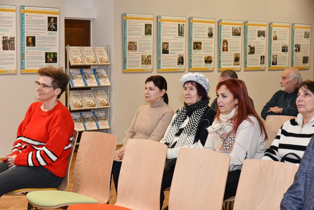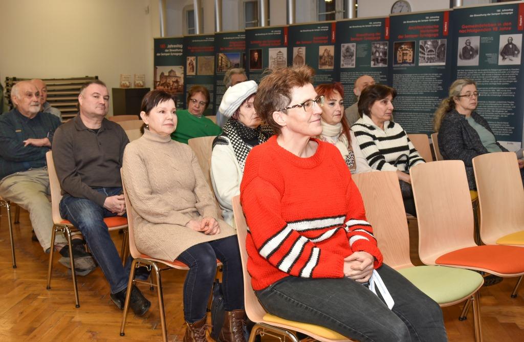 Nach einer musikalischen Pause übergab Konstantin Arkush das Wort an Frau Gunda Ulbricht vom HATiKVA, der Bildungs- und Begegnungsstätte für jüdische Geschichte und Kultur Sachsen e. V. Sie berichtete über die Arbeit ihren Verein mit Archivmaterialien über Juden und führte dabei einige Beispiele für Familiengeschichten an. Frau Ulbrichts Vortrag dauerte etwa 15 Minuten und wurde mit Applaus bedacht. Die Musiker spielten noch ein weiteres Stück, und damit war der offizielle Teil des Programms beendet.
